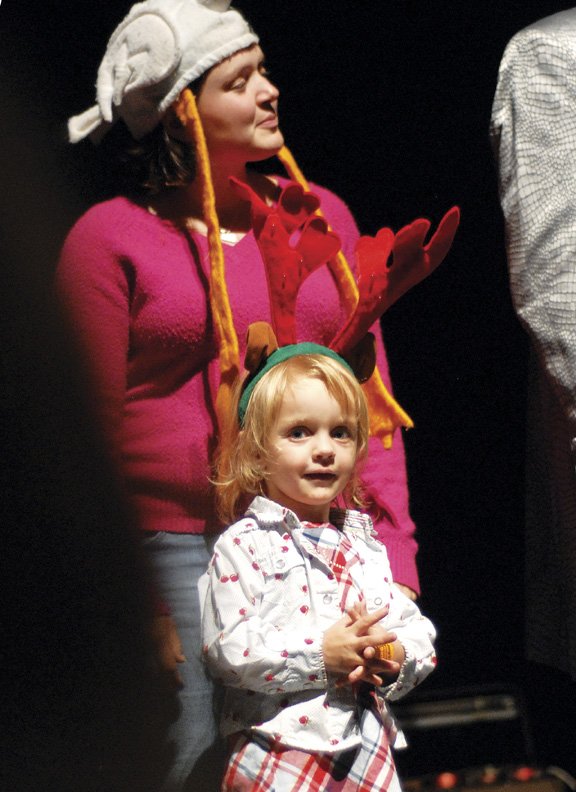 Cara Rayburn and her daughter Angel, 3, of Craig, get ready to do the “Chicken Dance” during the “Magic Magic Magic” show Saturday night.